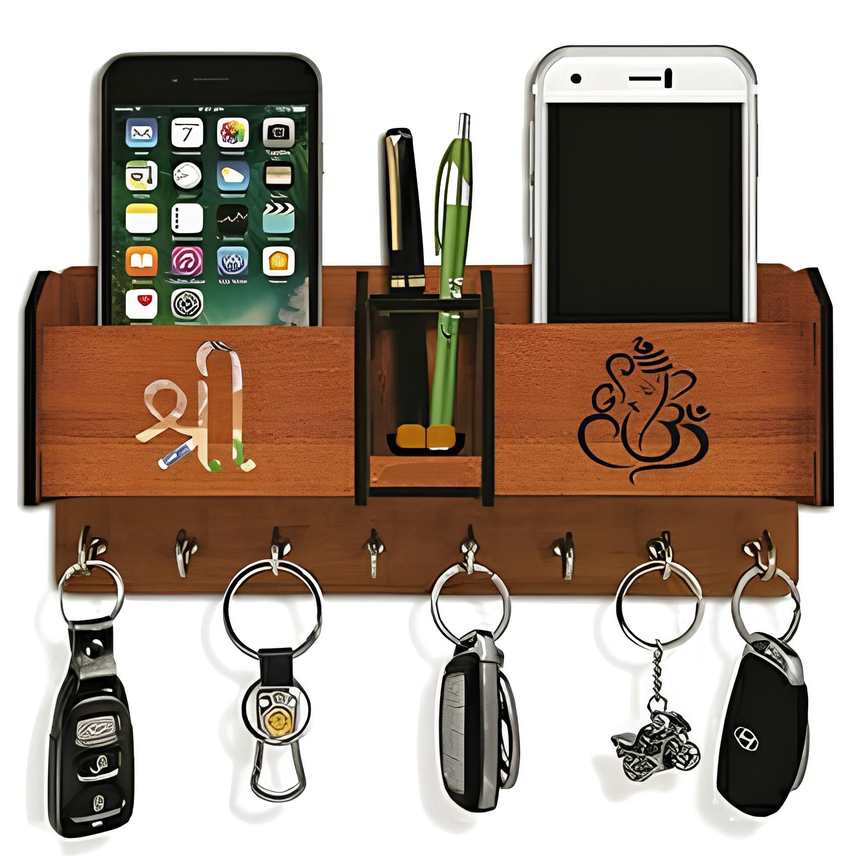 Wooden Wall Mounted Key Holder with Mobile Stand & Pen Holder